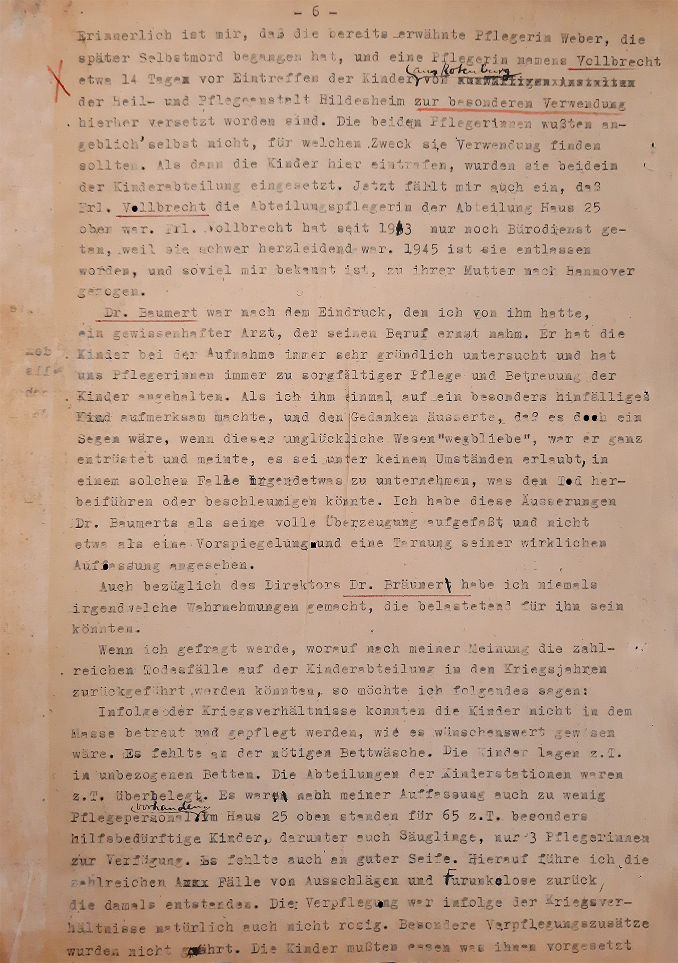 Po tym, jak Dora Vollbrecht skłamała podczas przesłuchania przez sędziego śledczego 22 maja 1962 r., dręczyło ją wyrzuty sumienia. Zwierzyła się znajomemu, który przekonał ją, aby powiedziała prawdę. W rezultacie 4 czerwca 1962 r. złożyła nowe zeznanie, w którym dokładnie opisała swój udział w morderstwie w »oddziale dziecięcym« w Lüneburgu.