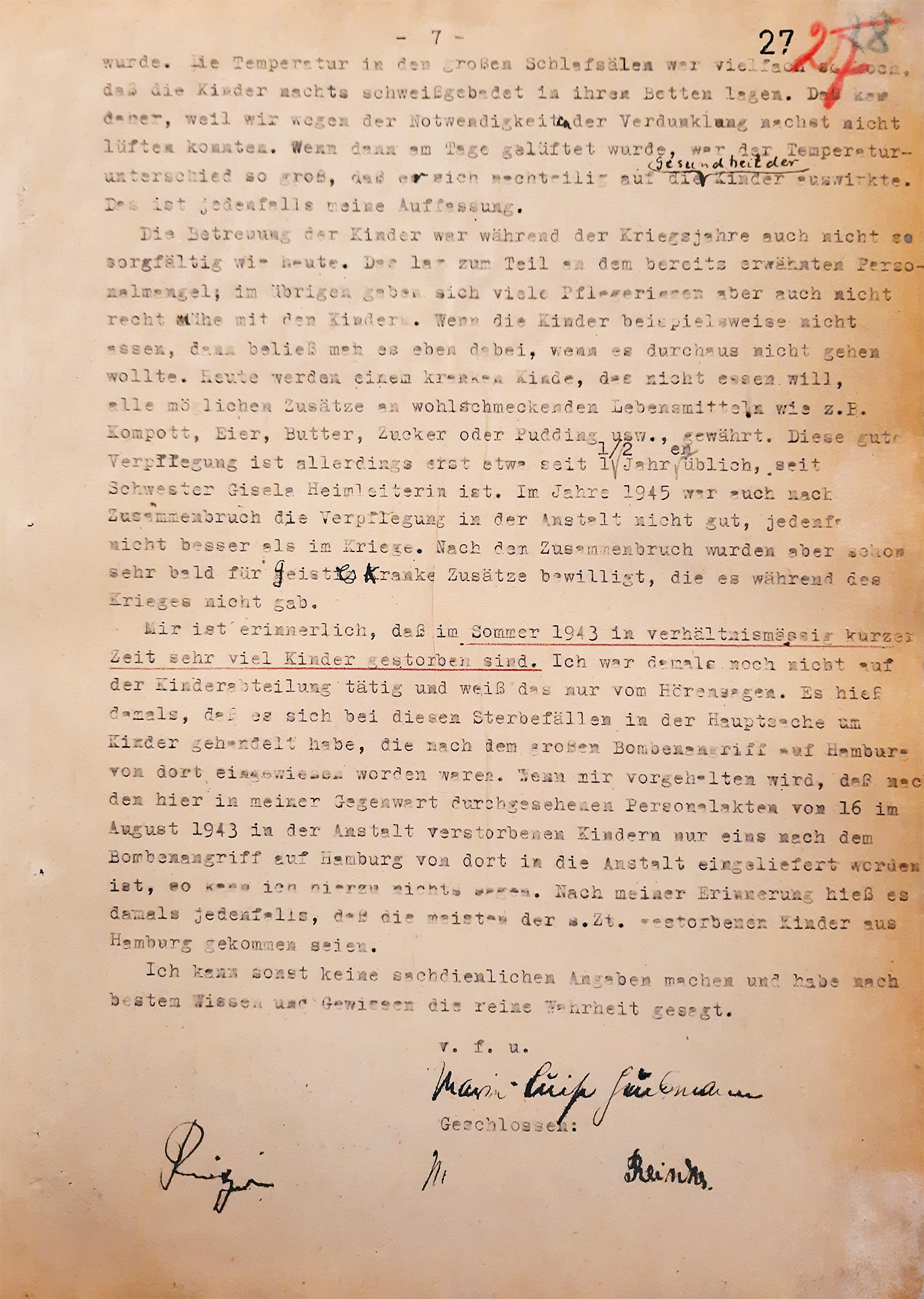 W 1947 r. wszyscy pracownicy zostali przesłuchani na temat wydarzeń w Lüneburgu. Odpowiedzieli niemal słowo w słowo, że w sanatorium i domu opieki w Lüneburgu nie było żadnych morderstw pacjentów. Wysoką liczbę zgonów tłumaczyli złą sytuacją zaopatrzeniową, a później wieloma ofiarami bomb z Hamburga. Porównanie protokołów przesłuchań pokazuje, że zeznania były zmową. Śledczy dali się oszukać.